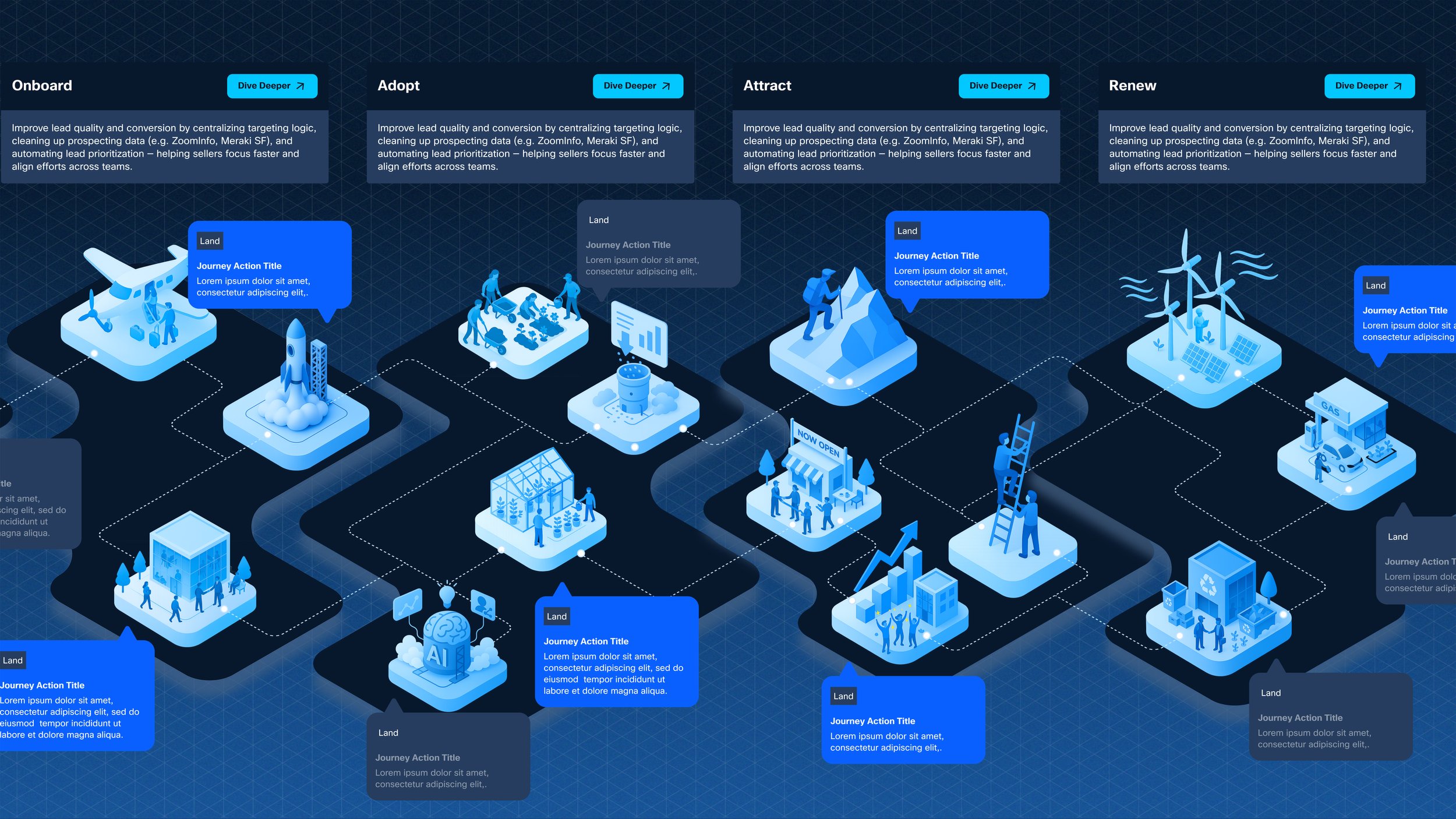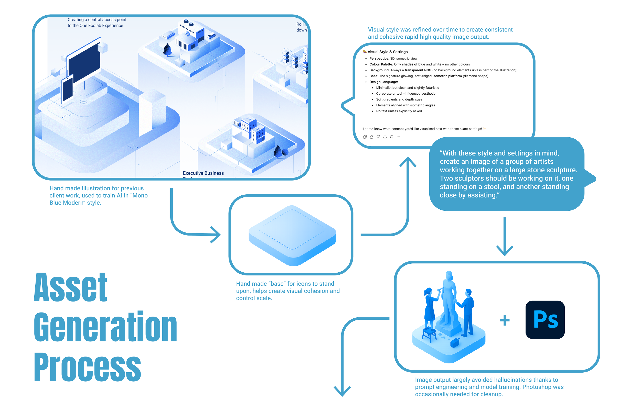 A Multinational Digital Communications Technology Company sought to create a tool which helped visualize their future ways of working. During this expansive multilayered project I mapped out and illustrated numerous journeys, utilizing genAI at multiple steps of the process.