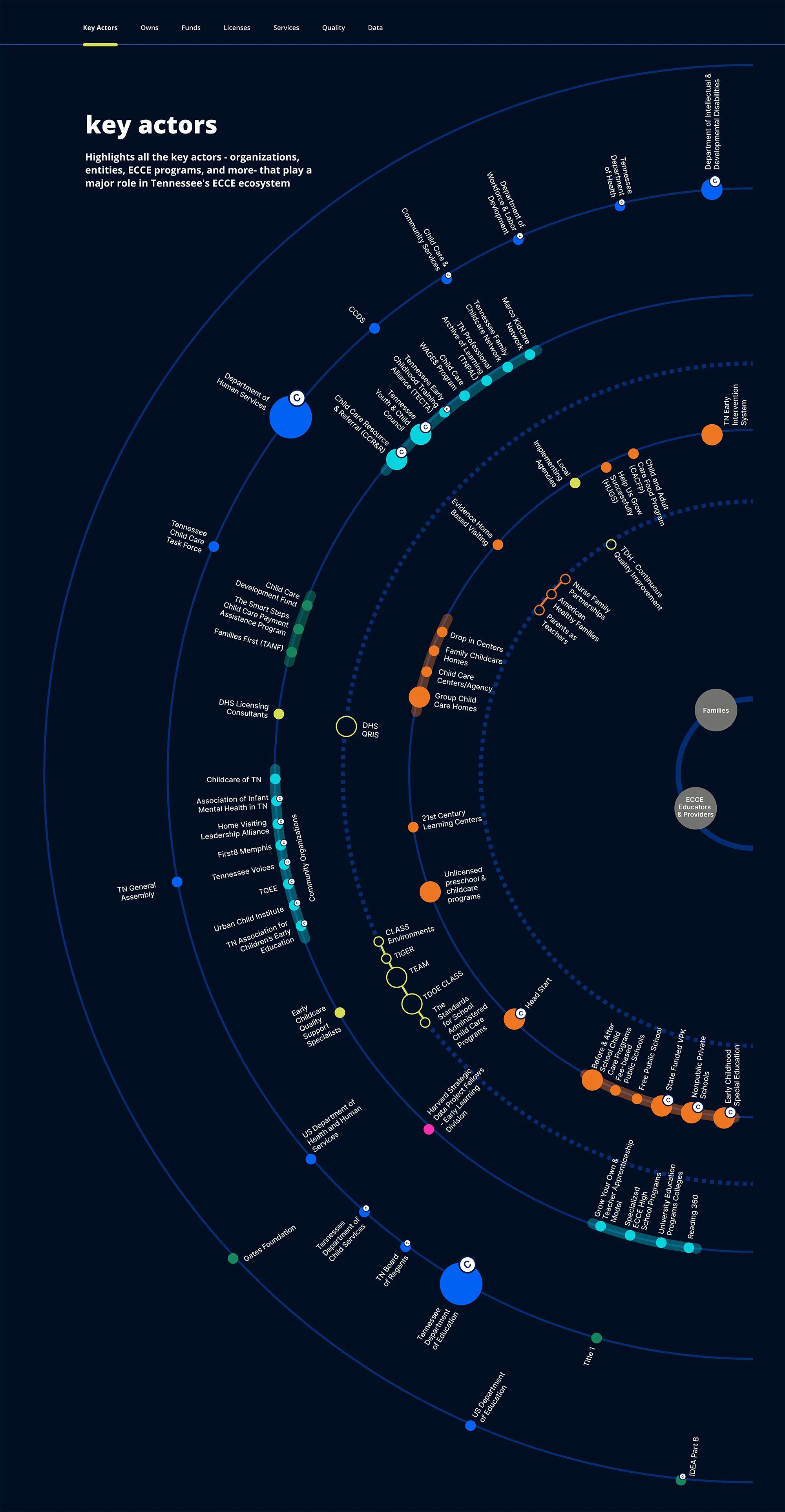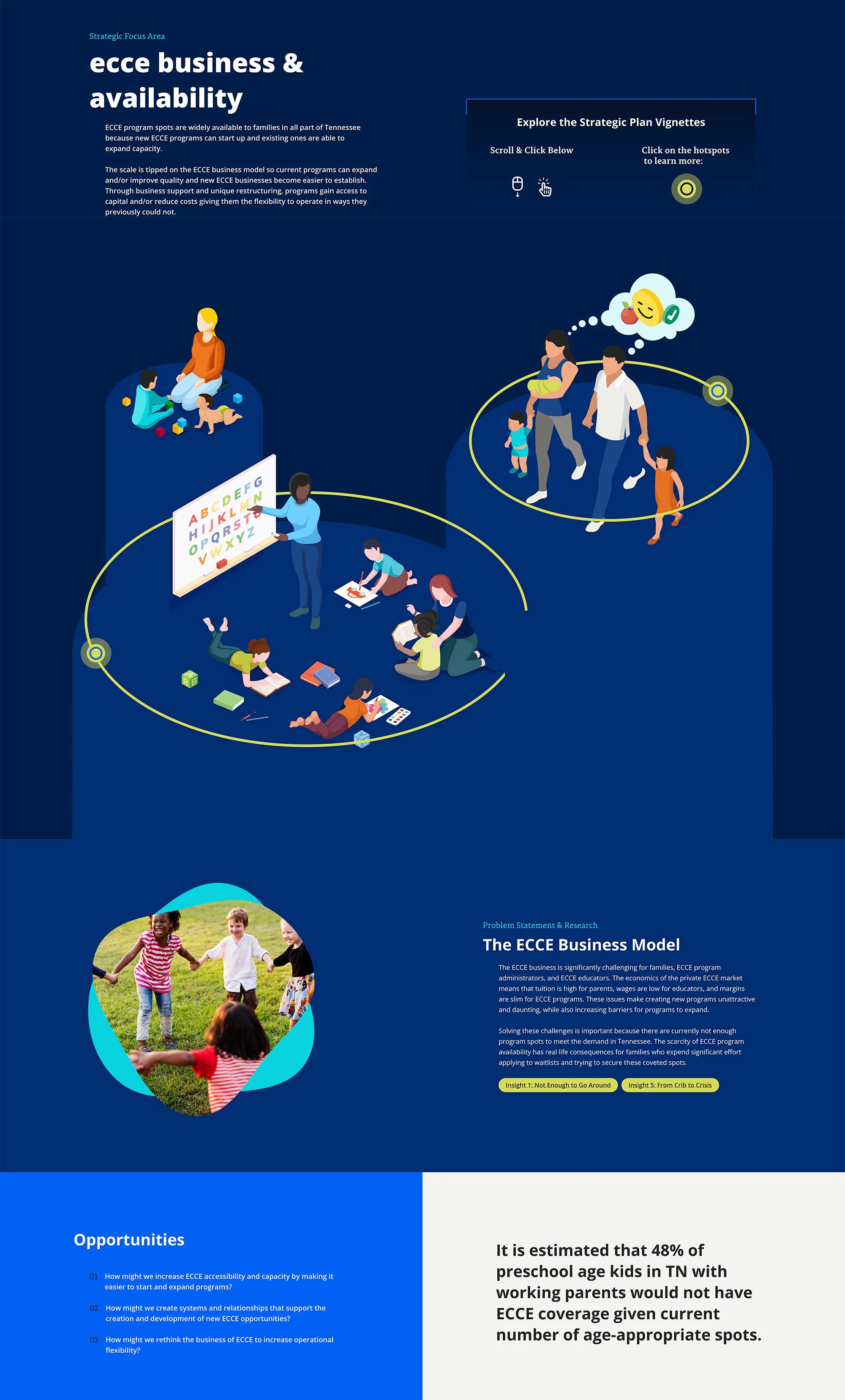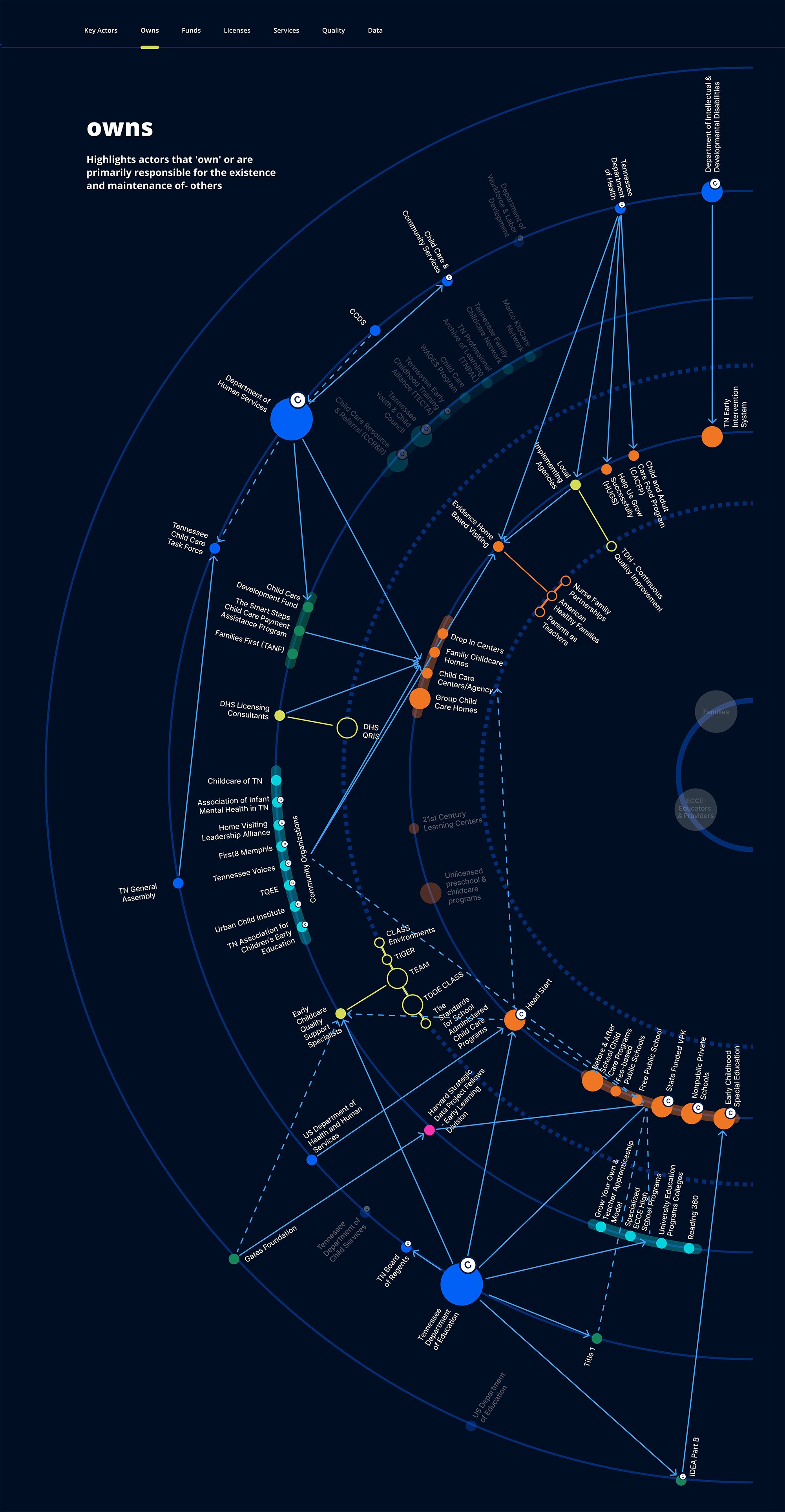 The leadership of Tennessee’s State Education Agency was looking for ways to better understand and improve the early childhood care and education systems within the state. This digital tool visualized and summarized 6 months of research, shown through user journey narratives and interactive digital mapping of infrastructure.